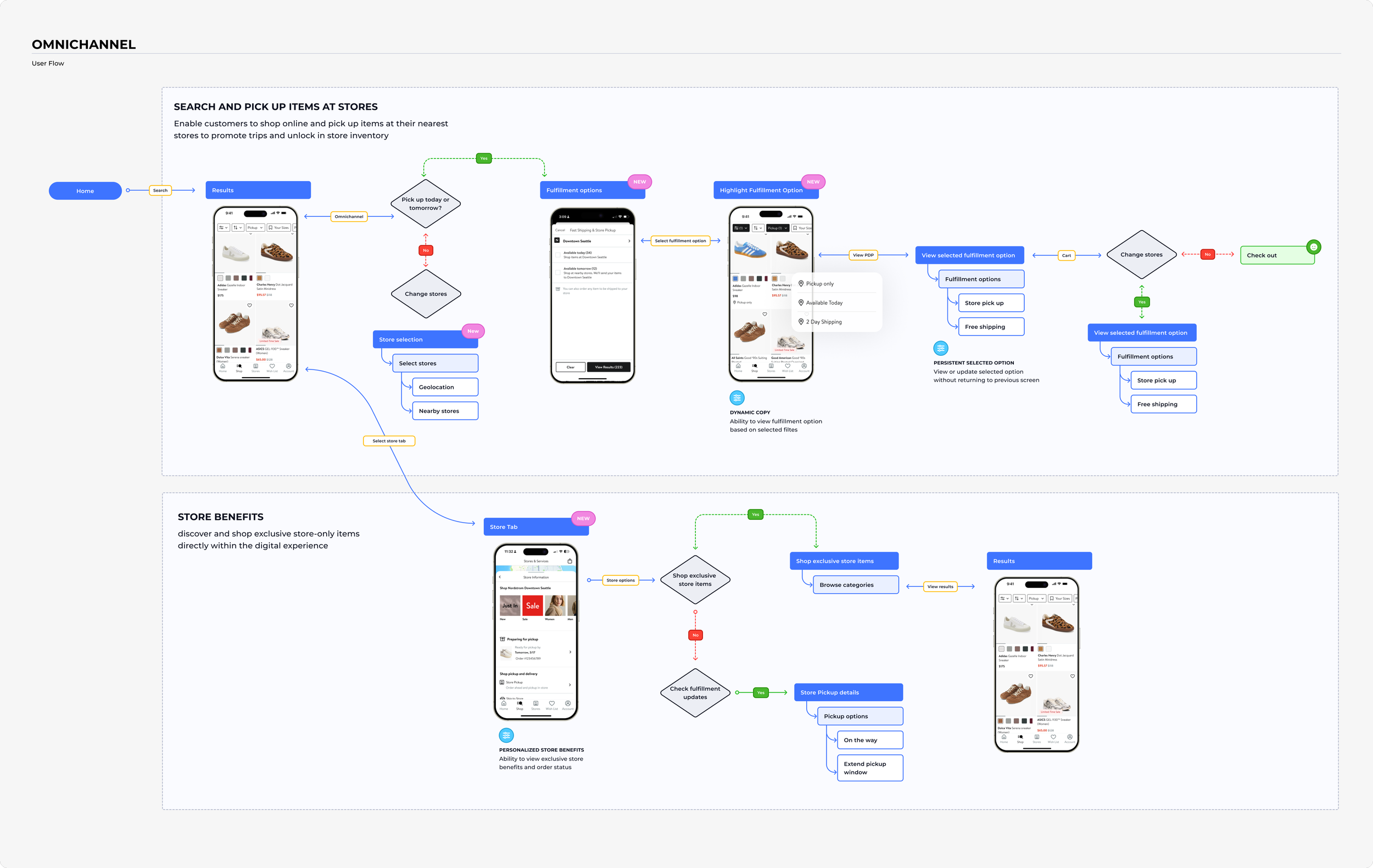 We found that customers weren’t getting clear info about store perks, pickup timing, or fulfillment options. So, we built a global store locator to bring all that upfront and making it easier to see the value of setting a store and connecting online and in-store shopping. A big design challenge was making the flow feel seamless across different user states, from choosing a store to finding products. By highlighting store benefits early, we helped customers understand what they gain by shopping or picking up in person.