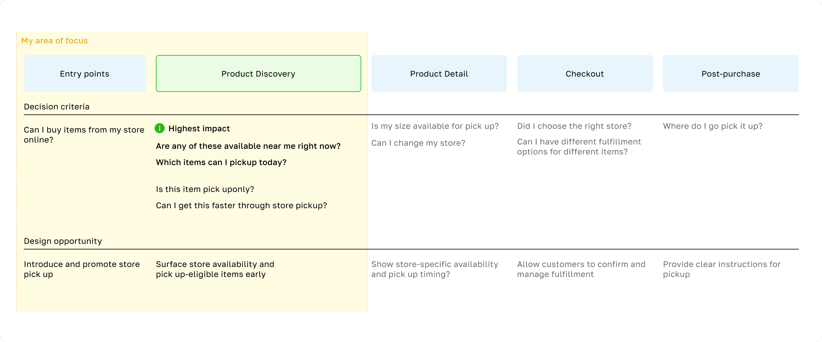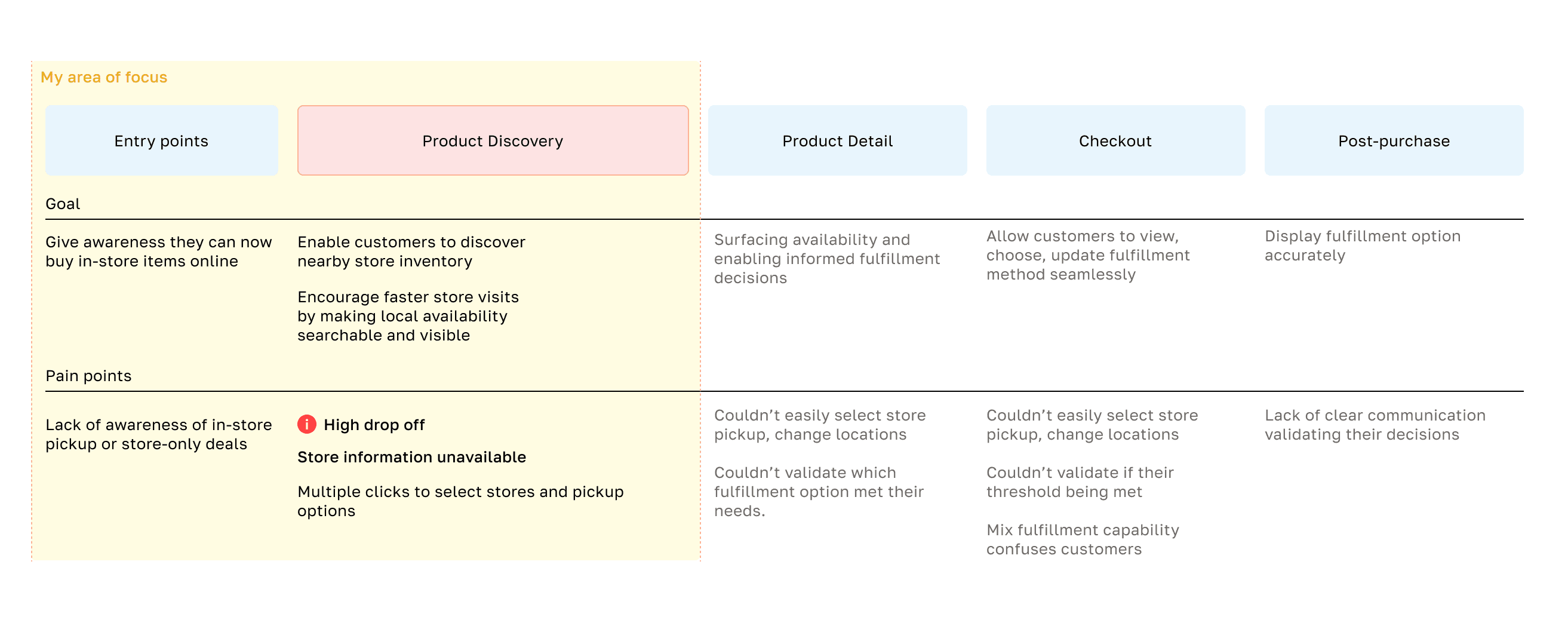 Using journey mapping, research, and competitive benchmarks, I identified discovery as the critical decision point for fulfillment. I introduced dynamic fulfillment messaging on product listing pages to surface pickup availability and readiness timing early, preventing customers from discovering constraints later in the journey.