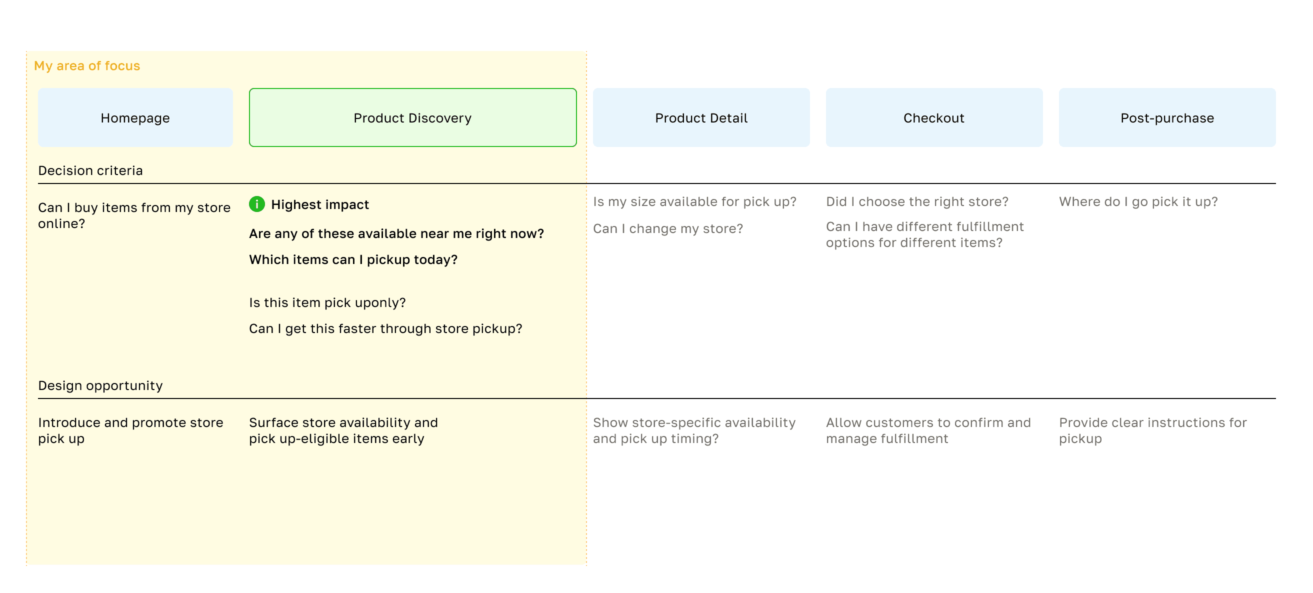 Using journey mapping and research insights, I identified where customers needed store availability information most and introduced omnichannel signals across the journey. My focus was discovery, addressing the highest drop-off point, while partnering with product detail and checkout teams to ensure a cohesive experience.