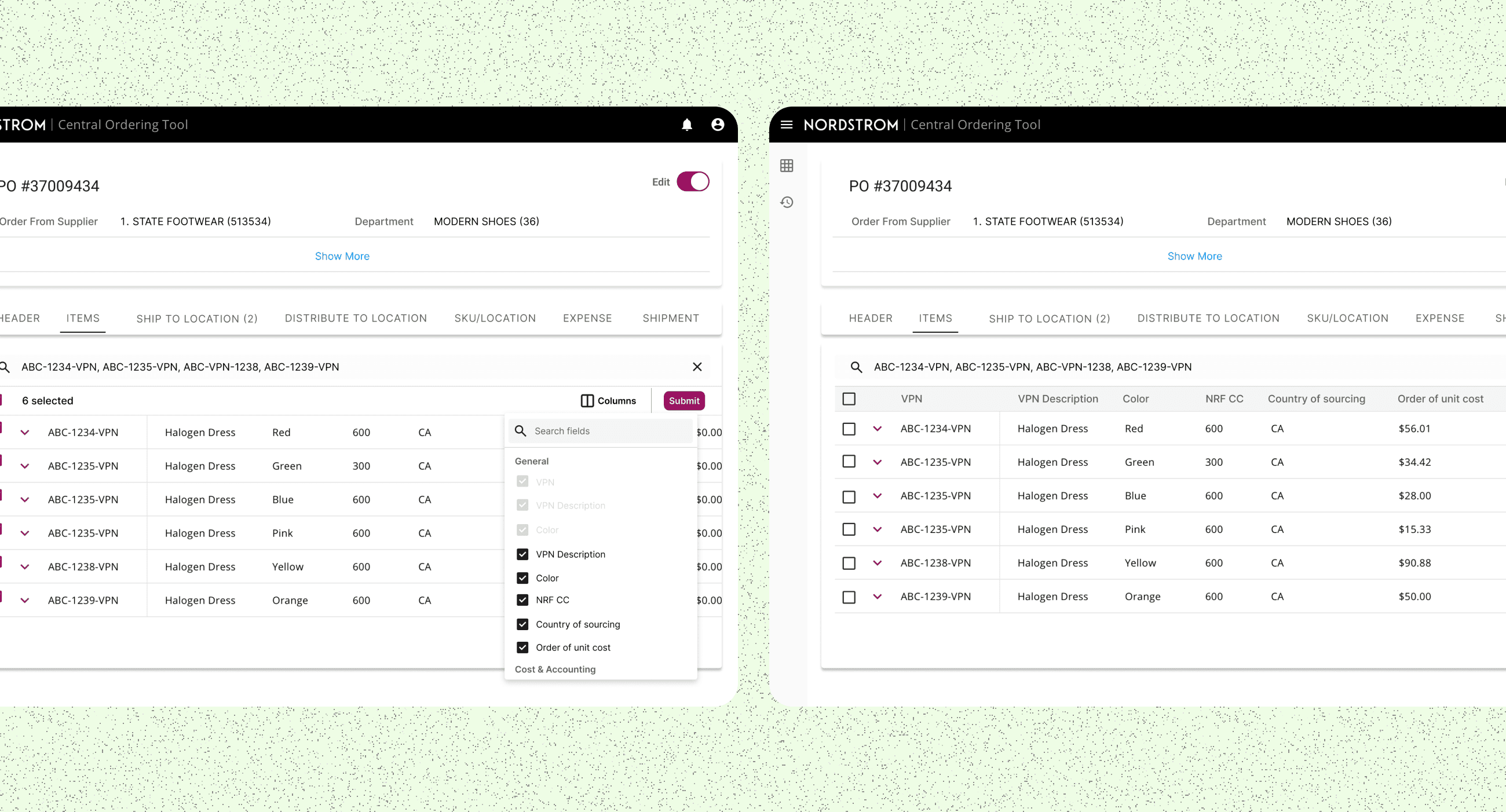 I redesigned the workflow to support cost changes directly within the purchase order tool, allowing employees to apply adjustments at any level with clear documentation and visibility into cost history. By making changes transparent and traceable, employees could manage costs more efficiently, understand pricing decisions over time, and confidently support vendor negotiations.