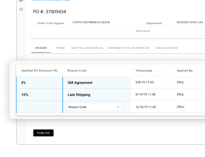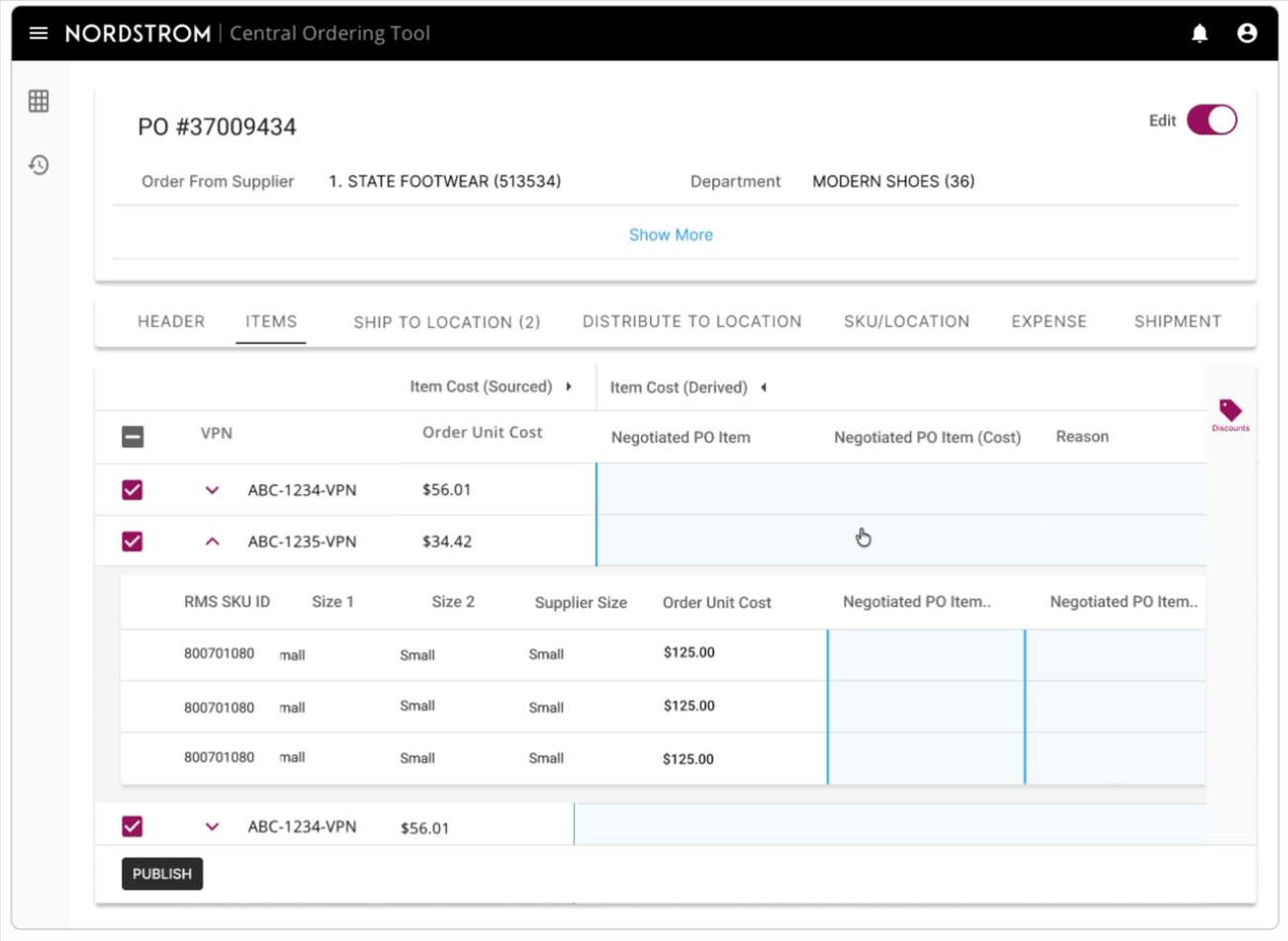 Through usability testing and workflow analysis, I identified the need to support both high-level cost adjustments and detailed, item-level changes. I designed a centralized discount management experience within the purchase order summary that allowed employees to apply, view, and track cost changes in context while maintaining full traceability.