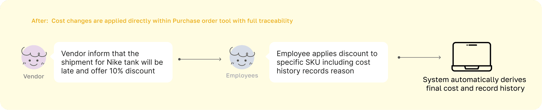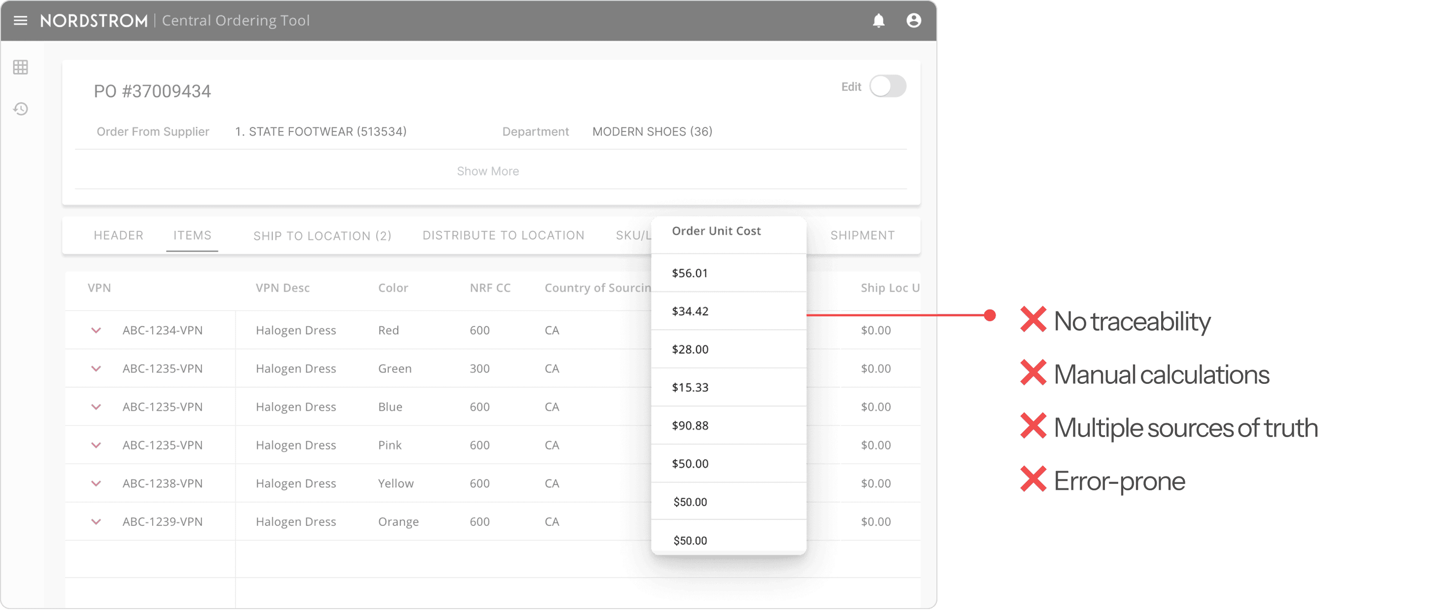 Employees relied on external tools like spreadsheets to track and apply cost changes because the system couldn’t support pricing scenarios whether adjusting an entire order, specific SKUs, or individual item variations. There was no clear record of who made changes or why, making it difficult to understand cost history and confidently negotiate with vendors. This created inefficiencies, increased risk of errors, and reduced trust in the system.