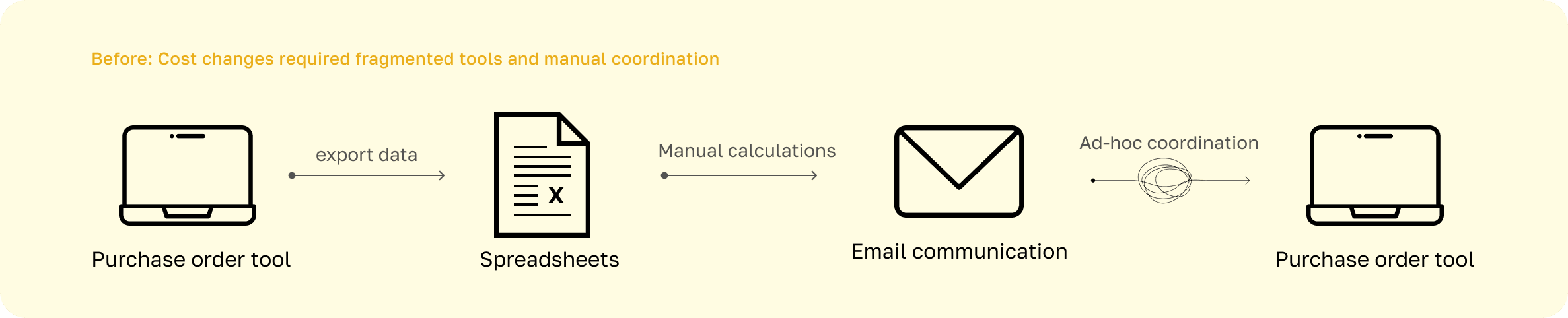 These fragmented and manual processes increased cognitive load, introduced risk of error, and slowed decision-making, making it difficult for employees to confidently manage purchase order costs.